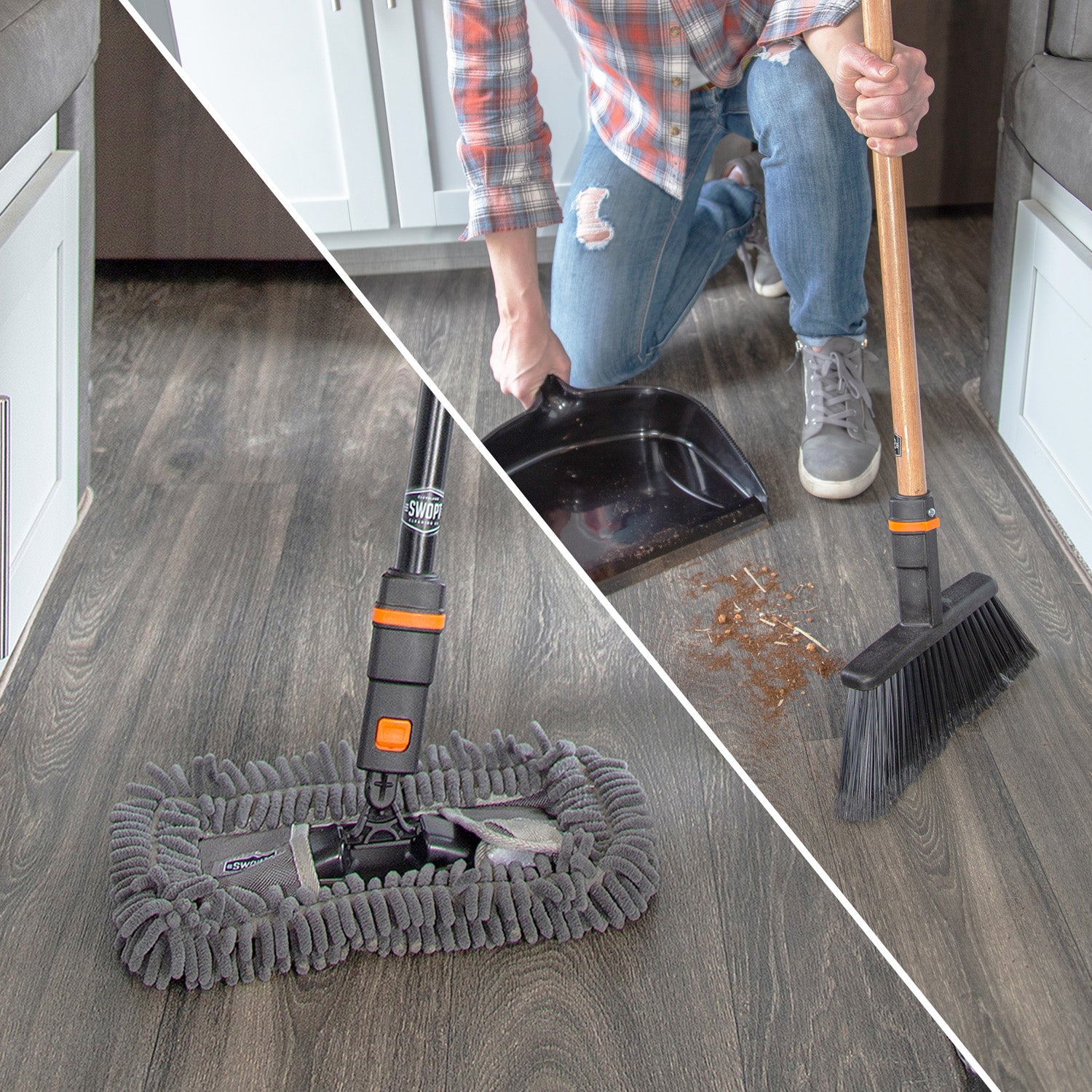 The SWOPT™ Indoor Cleaning Kit is part of the SWOPT™ Cleaning’s interchangeable cleaning system. The cleaning kit includes the SWOPT™ 11 in. Standard Multi-Surface Angle Broom Head, the SWOPT™ 12 in. Microfiber Dust Mop Head, and the SWOPT™ large plastic dust pan. The 11 in. angle broom head is designed to maneuver around furniture and in corners as it sweeps to pull dirt from hard-to-reach places. It features medium-stiff bristles that efficiently trap dirt and debris from surfaces of all kinds. The 12 in. microfiber dust mop head features a dual action microfiber cleaning pad that picks up dust and pet hair in hard-to-reach areas and is great for use on wood, laminate, and tile floors. It is machine washable and reusable. The plastic dust pan efficiently sweeps up dirt and debris. It is a great kit for indoor applications. Thanks to innovative SNAPLOCK™ Technology, each of the brush heads can be ‘SWOPT’ with the push of a button and attached to any of our SWOPT™ handles, which do not twist loose due to patented technology. Take back your closet with SWOPT™ by using one SWOPT™ handle with multiple cleaning heads and save money and space in your home! Our products are sleek and stylishly designed. Additionally, SWOPT™ products are manufactured and packaged with sustainability and reusability in mind in an effort to contribute to a more eco-friendly planet. Handle sold separately.