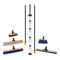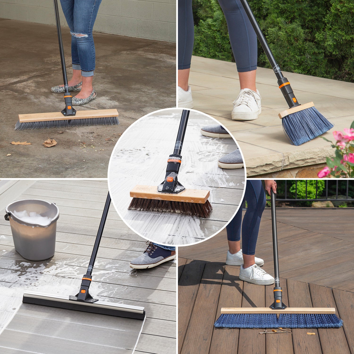 The 11 in. angle broom head is designed to maneuver around furniture and in corners as it sweeps to pull dirt from hard-to-reach places. It features medium-stiff bristles that efficiently trap dirt and debris from surfaces of all kinds. The 24 in. multi-surface surface push broom head features bristles with a stiff inner core for moving large debris and a soft border for picking up finer particles. The 24 in. smooth surface push broom head features smooth surface bristles that are great for picking up finer particles. The 10 in. premium rough surface deck brush head features stiff bristles that provide heavy-duty scrubbing power over rough and textured surfaces and is great for scrubbing driveways, sidewalks, patios, and decks. The 24 in. floor squeegee head features an aluminum frame and flexible foam squeegee for use on smooth and textured surfaces. The standard steel handles can be attached to any of our SWOPT™ cleaning head accessories.